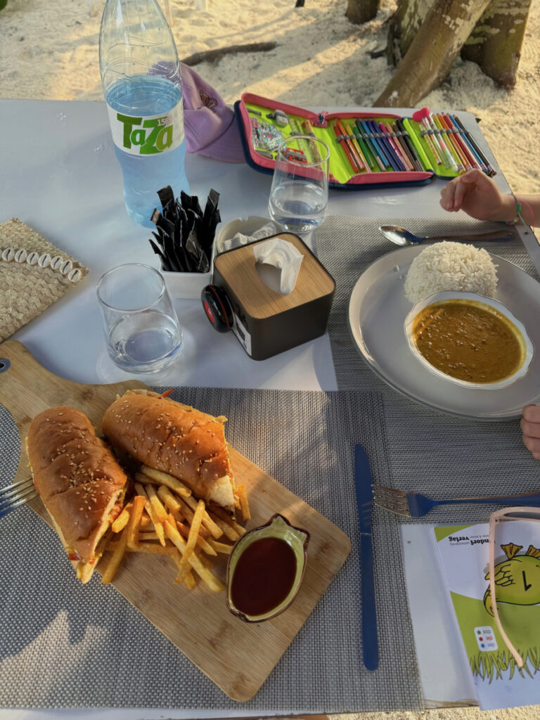 Wenn Ihr aber ein kleineres Budget habt, oder einfach mehr „Abenteuer“ und auch Land und Leute auf den Malediven besser kennenlernen wollt, dann ist Dhigurah Eure Destination. Wichtig ist auch zu bedenken, dass es KEINEN Alkohol auf Dhigurah zu trinken gibt und die Restaurants eher einfacher sind. Dafür sind die Preise wirklich sehr fair und wir haben (selbst mit wählerischem Kind) überall gut gegessen. In den kleinen Supermärkten könnt Ihr Euch mit Snacks und Getränken für den Strand eindecken.